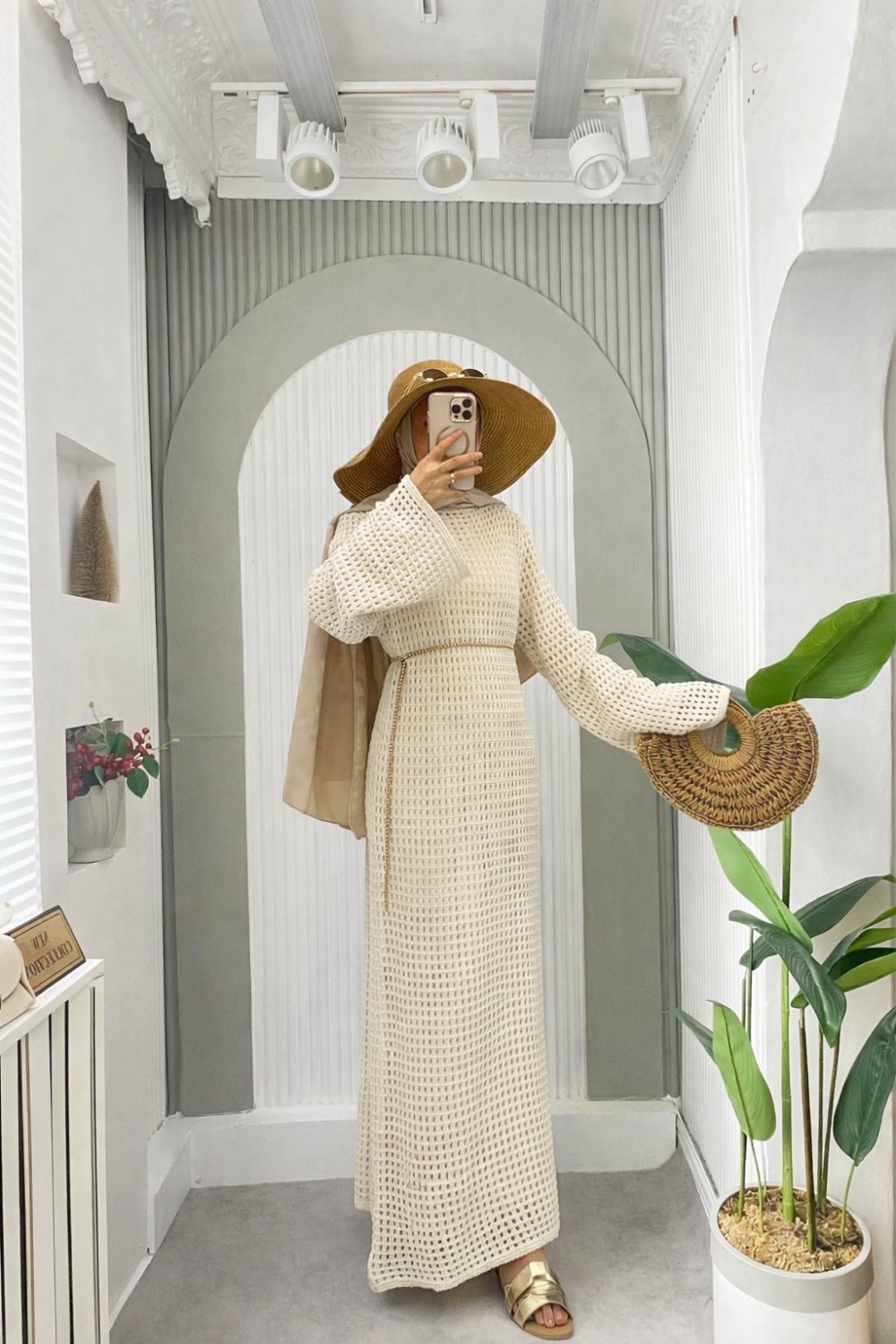 Ajur Triko Kemerli Elbise Ekru